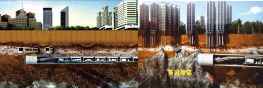深圳地铁项目 砾质粘性土、花岗岩等。共有17台盾构分别应用于深圳地铁9号线及11号线,其中6台为直径6.98米的大断面电驱盾构。针对穿越过程存在长距离的微风化花岗岩,盾构设计在减少刀盘刀间距、增大刀盘驱动扭矩的同时,增强了刀盘及主轴承承受偏载能力。所有盾构在深圳体现出了优秀的地质适应性。中铁68号目前已累计掘进2600米,日进度为24米,月最高进度为558米。